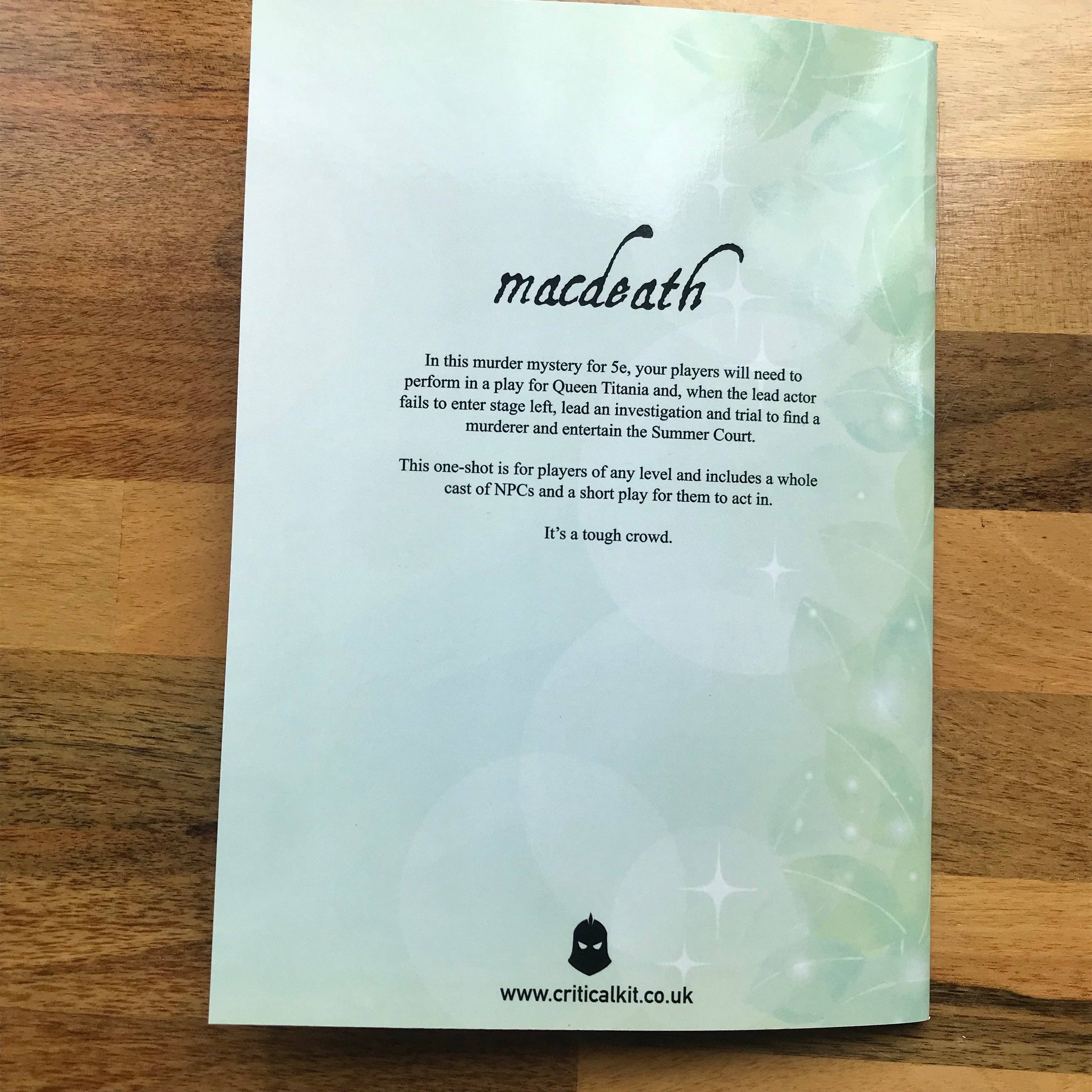 Macdeath is a 5th edition murder mystery with a difference. Set in the FeyWild your players must perform a play for The Queen of The Summer Court and then solve the heinous murder of a cast member. To succeed in this one shot adventure, they must entertain the queen.